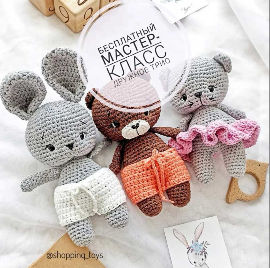 Три игрушки по одному описанию (котик, зайчик и мишка) бесплатный мастер класс