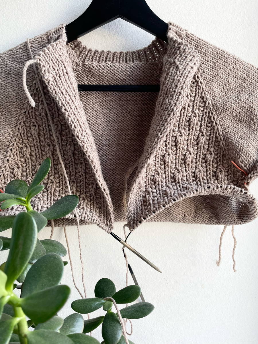 Вязаный кардиган с рюшами на рукавах и узором на полочках.