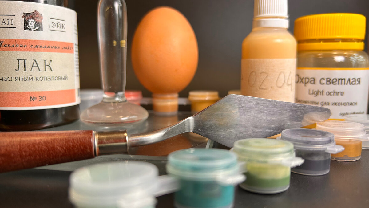 Русские иконы традиционно пишутся темперными красками приготовленными на курином яйце. Большинство современных иконописцев использую для замешивания краски, только желток и уксус в качестве консерванта. Однако старые мастера писали иконы и фрески цельно-яичной темперой. Приготовление такой краски сложнее. А в письме требуются больший опыт, так как исправлять ошибки совсем не просто. Для приготовления краски лучше использовать деревенское, оплодотворенное яйцо. Первым делом аккуратно расколоть скорлупу и отделить желток. Надрываем мешочек желтка и сливаем содержимое в отдельный стакан. В другом стакане взбиваем белок и даем отстояться. К желтку добавляем льняное, лавандовое масло и копаловый лак в общем количестве 1/2 чайной ложки. Затем доливаем жидкий белок без пенки. Теперь добавляем яблочный 6% уксус и смешиваем все компоненты. Эмульсия для краски готова. Сухой пигмент заливается эмульсией и растирается курантом на стеклянной поверхности. Задача получить относительно жидкую