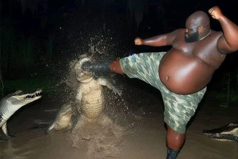 Мем "Толстяк ест пиццу и бьет аллигатора" действительно стал популярным в интернете. Он основан на снимках, где чернокожий парень кажется толстым и ест пиццу в болоте, а затем бьет ногой аллигатора. Эти изображения были сгенерированы нейронной сетью, и благодаря своей странности и комичности мем быстро распространился в сети, вызвав множество шуток и пародий. Происхождение. "Толстяк ест пиццу и бьет аллигатора". Этот мем стал популярным благодаря комичной ситуации, изображенной на снимках, где толстяк, находясь в болоте и питаясь пиццей, встречает аллигатора. Реакция толстяка на встречу с аллигатором, а именно его решительный удар ногой в голову аллигатора, вызывает смех у пользователей интернета и вдохновила множество шуток и пародий. Впервые эти снимки опубликовал 30 сентября пользователь Facebook ExtremeAiArt. На своей странице Uncle Mike’s Photography автор давно занимается созданием странных изображений. В его подборке оказались и другие безумные генерации с пиццей. 31 сентября по