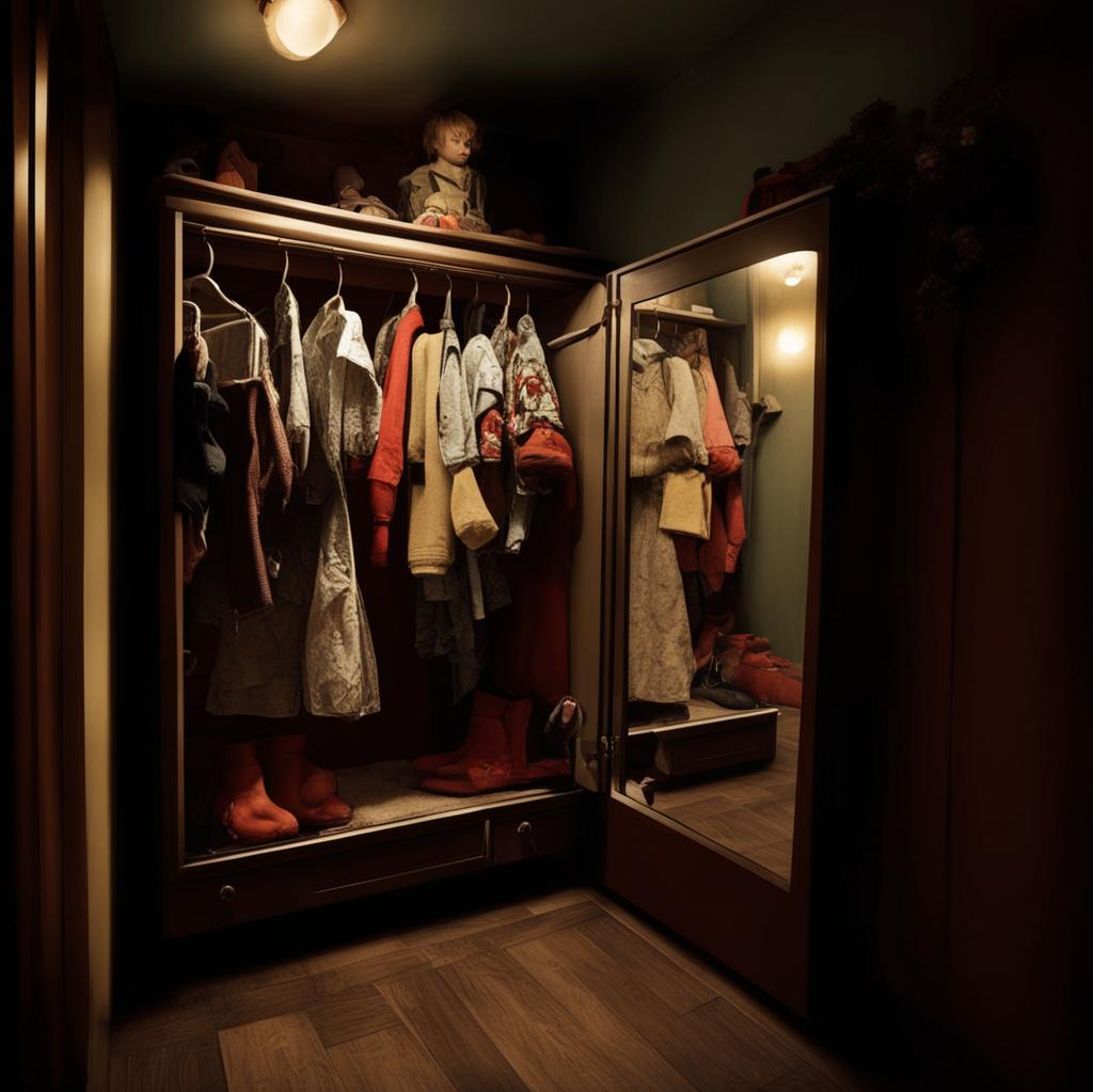 Внутри шкафа на дверце было встроенное большое зеркало, почти в рост девочки. Девочка была храбрая и любознательная. А еще она очень любила проверять свою храбрость, поэтому часто открывала шкаф ночью и играла в "гляделки" со своим отражением. И она почти всегда побеждала, лишний раз убеждаясь в своей храбрости. И вот однажды, одним поздним вечером, в очередной раз решив доказать себе, что она ничего не боится, девочка открыла шкаф и стала смотреть в зеркало. В этот раз, видимо из за каких-то игр света и тени, получился интересный эффект. В зеркале храбрая девочка отражалась с очень бледной кожей, пустыми провалами глаз и большим, искажённым ртом. Отражение было очень живым и как будто объемным. Девочка полюбовалась на отражение, убедилась в своем бесстрашии и закрыла дверцы шкафа. Уже идя к своей кровати, она кое-что вспомнило, что заставило её закричать и растеряв всю свою храбрость побежать с огромной скоростью в спальню к родителям.