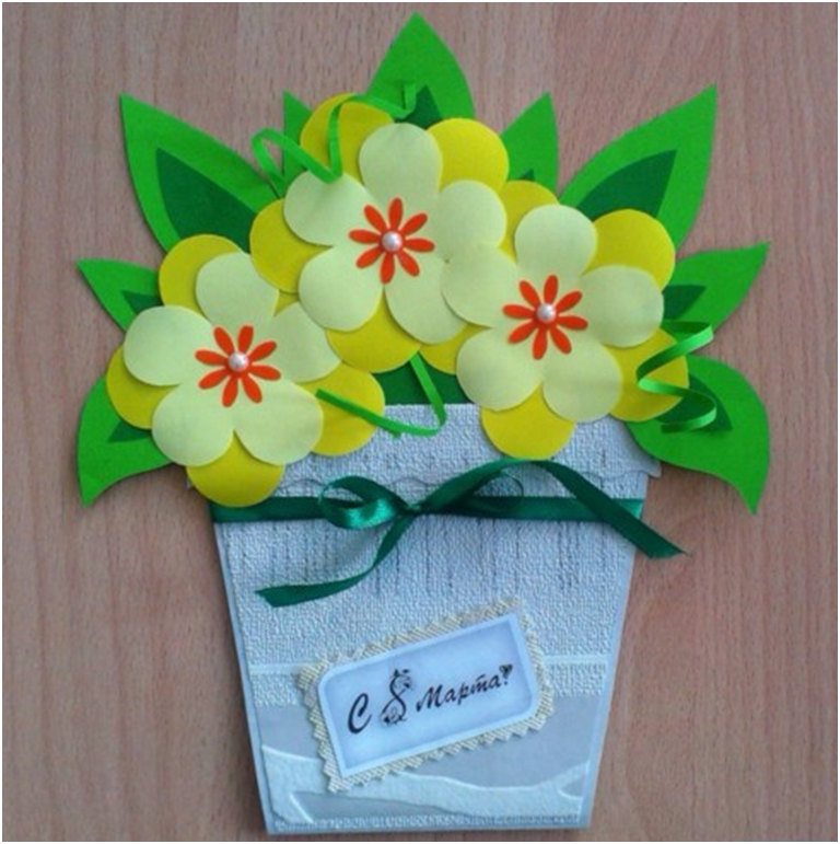 Остались считанные дни до следующего праздника, на улице ярче светит солнышко, а значит пришла весна и принесла с собой отличное настроение и положительные впечатления и эмоции. В преддверии международного женского дня хочу предложить вам сделать открытки на 8 марта. Первым делом нарисуйте заготовки, это делается обычным простым карандашом. Вы можете взять идею отсюда, чтобы самим не придумывать и не додумывать. Для самых маленьких сделайте картонные заготовки, чтобы они по ним обвели. Сам горшочек будет выполнен из обойных ленточек, можно даже взять и ткань. тут уже дело вашей фантазии и сколько лет вашим подопечным. Конечно для детей 3-5 лет подойдет самый простой вариант аппликации из обычной цветной бумаги, а детям постарше и начальной школы можно предложить использовать ткань, например фетр, также фоамиран. Все детали вырежьте и подготовьте к работе. Украсьте ленточками и поздравлениями с пожеланиями. Даже из пластилина и цветных карандашей с самыми маленькими можно сделать такое