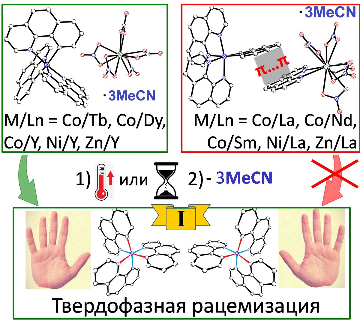 Ученые из Института общей и неорганической химии им. Н.С. Курнакова РАН впервые изучили твердофазную рацемизация трис-хелатных катионных комплексов [M(phen)3]2+ (где M = Co2+, Ni2+, Zn2+ и phen = 1,10-фенантролин) – как на уровне отдельного монокристалла, так и в поликристаллических образцах. Кроме того, впервые установлено, что рацемизация таких комплексов может происходить только в случае отсутствия в структурах π…π стэкинг взаимодействий с участием координированных лигандов phen.
