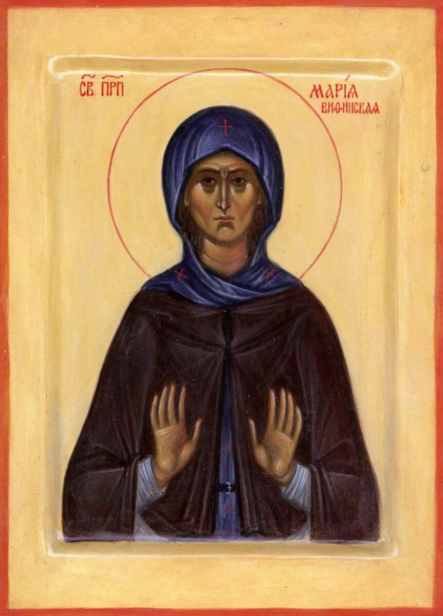 Мария и её отец Евгений жили в Малой Азии в начале VI века. Когда умерла мать Марии, Евгений захотел уйти в монастырь. Марии жаль было расставаться с отцом и она пошла с ним, переодевшись в мужскую одежду. В обители она представилась как Марин и стала очень прилежным иноком. Через несколько лет Евгений отошёл ко Господу и Мария-Марин ещё больше усилила молитвы и послушание. Однажды иноков, в том числе и Марию, послали на монастырский огород, который находился далеко. И братии пришлось заночевать в гостинице. У хозяина гостиницы была дочь, которая согрешила с одним из постоянных постояльцев. Не желая выдавать своего любовника, девушка сказала, что её соблазнил "инок Марин". Хозяин гостиницы пожаловался игумену монастыря, и Марию выгнали из обители. Она не сказала ни слова в своё оправдание, лишь стала смиренно жить у монастырской стены. У девицы родился сын и хозяин гостиницы принес его Марии. Она приняла младенца и воспитывала его, как родного сына. Через три года, по просьбам братии,