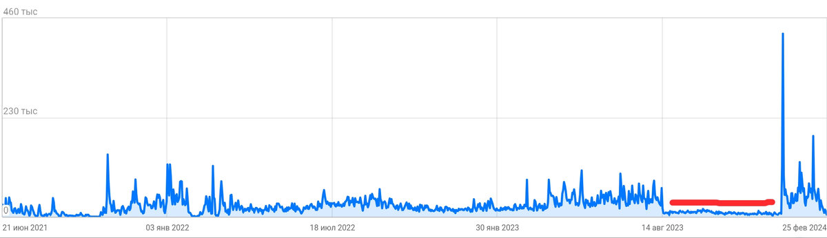 Здравствуйте, друзья. Давно не делал отчётов о жизни канала, вот, думаю, пришла пора это сделать. В прошлом отчёте, в первых числах января 2024 года, я рассказал, что с августа 2023 года Дзен обрубил показы канала в общей ленте не подписчикам. На 90-95% всех показов было только подписчикам, хотя многие годы жизни канала более 90% и показов было не для подписчиков. Но в начале августа кто-то нажал "тумблер" и канал был фактически уничтожен, так как когда нет показов в общей ленте, то нет развития, происходит резкая деградация канала. Этот период я отметил красной полоской на графике. Как видно, в тот период стояло жесткое ограничение и канал не мог пробить определённый порог. Каждый день канал читало определённое среднее число подписчиков и всё. Техподдержка, конечно, как всегда, ничего объяснить не смогла (скорее ей запрещено говорить правду). Но вдруг, 4 января 2024 года, что-то случилось и показы канала вернулись в стандартный режим (как на других каналах, которых не выживают с площа