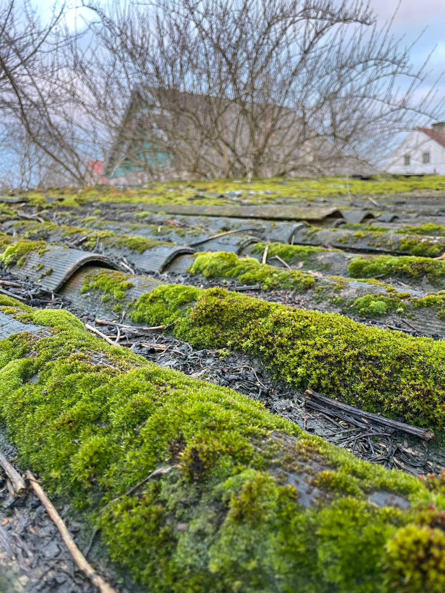 Недавно с Сашей заговорили про крышу дровеника. Она покрыта шифером, а шифер со временем зарос мхом.