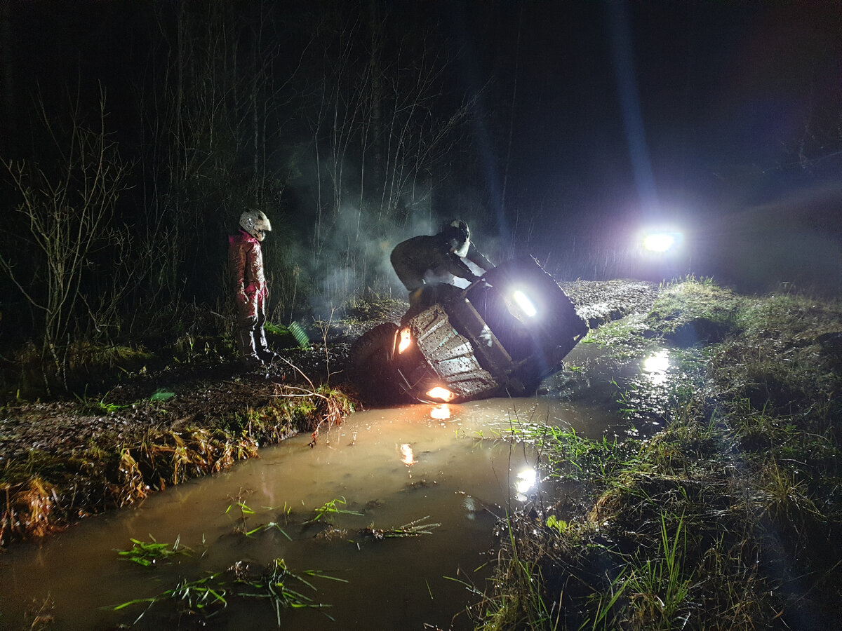 Девушка по имени Катя села пассажиром сначала к Денису и квадроцикл тут же перевернулся в колее.