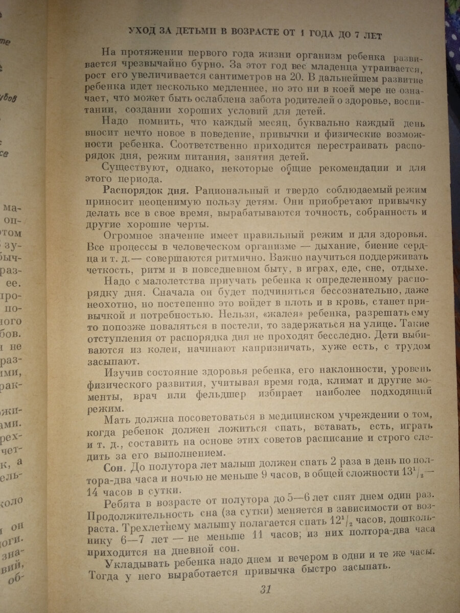 Сегодня публикую страницы книги об уходе за детьми до семи лет. Режим дня очень помогает и родителям и детям. За первый год жизни ребенка в семье складывается определенная последовательность активности и отдыха, после года этот режим постепенно корректируется естественным образом. Дневной сон проще организовать после обеда, так чтобы ребенок не успел отвлечься на игры. Уложить детей спать не сложно, если это делать в одно и то же время ежедневно. Иногда дети капризничают и не хотят ложиться спать днем. Своих я уговаривала притвориться спящими, закрыть глазки и полежать так недолго. Обычно засыпали. Дочка спала всегда меньше, поэтому, когда она просыпалась, я ее уводила в другую комнату играть, чтобы сына не разбудила раньше времени. Отдельно детям готовить наверное не стоит, просто готовится только то, что можно есть детям. Не помню, чтобы в семье была отдельно взрослая и детская еда когда я росла. Большинство детей ходит в детский сад с трех лет и основные приемы пищи у детей в детск