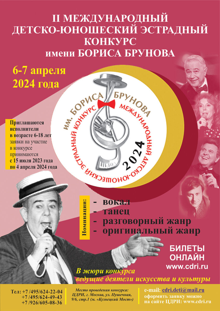 Международный детско-юношеский конкурс эстрадного искусства им. Бориса БРУНОВА Старейший творческий Дом России — легендарный Центральный Ордена Дружбы народов Дом работников искусств — проводит Международный детско-юношеский конкурс эстрадного искусства имени Бориса Брунова, который пройдет в Москве с 6-го по 7-е апреля 2024 года в ЦДРИ по адресу: г. Москва, ул. Пушечная, 9/6, стр.1 (м. Кузнецкий Мост). Конкурс проводится в очной форме по четырем номинациям: речевой жанр, танец, вокал, оригинальные и эстрадно-цирковые номера. Участниками конкурса могут быть исполнители от 6-ти до 18-ти лет. Оценивать выступления участников конкурса будет компетентное жюри, в состав которого войдут ведущие деятели искусства и культуры. Конкурс проводится в целях популяризации творческих достижений детей и юношества, повышения роли искусства в гармоничном воспитании и развитии подрастающего поколения, организации досуга и пропаганды здорового образа жизни. Конкурс позволит деятелям