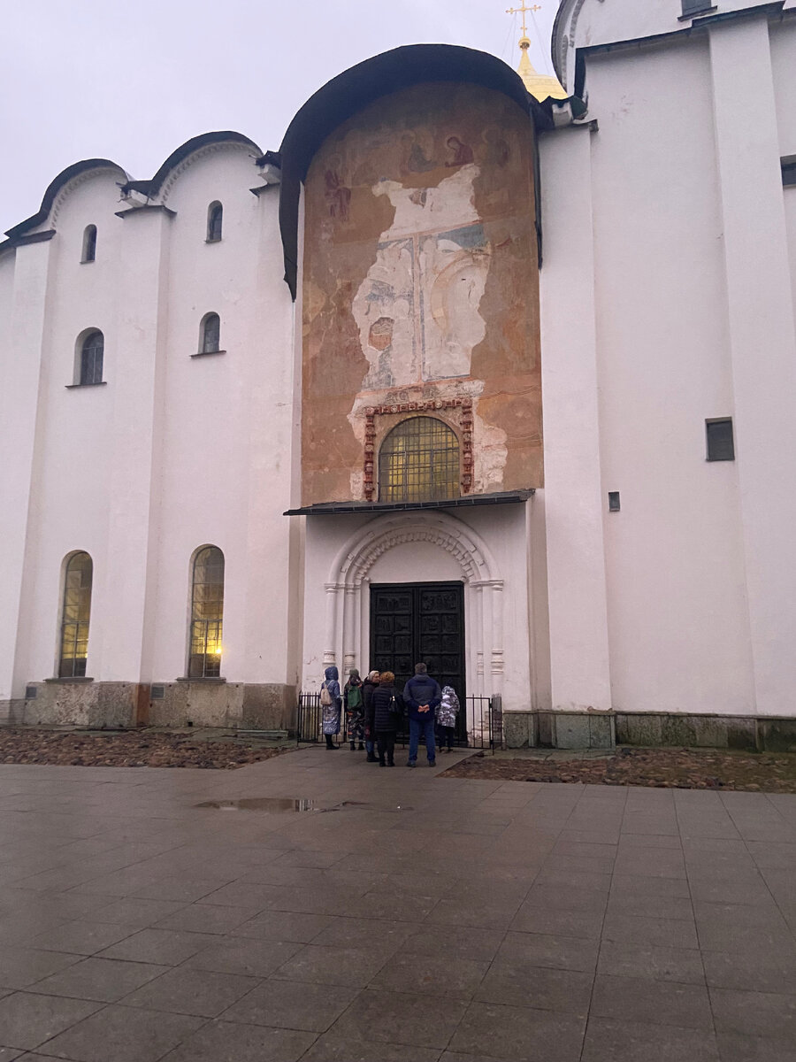 Надежды на то, что нам удастся послушать хотя бы одну экскурсию, было мало! На территории Кремля находится храм «София» Новгородская. Мы отправились внутрь. Там оказалось настолько красиво, что я пошла узнать нет ли свободного экскурсовода.Служительница храма пообещала нам помочь. Через некоторое время, она вернулась и сказала, что нам согласились провести индивидуальную небольшую экскурсию. К нам вышла одна из хранителей храма, она же является и реставратором. Софийский собор – самый древний храм России, построен в 1045–1050 гг. по заказу новгородского князя Владимира, сына Ярослава Мудрого.Стены собора выложены из камня, известняка, ракушечника и плинфы на цемяночном растворе с добавлением молотого кирпича. В стены собора встроены голосники – специальные керамические сосуды. Их особое расположение обеспечивает в храме прекрасную акустику, при этом в нем нет эха. Центральный купол впервые позолочен в 1408 году, на нем сидит свинцовый голубь ( я увидела это впервые).Главный (западный