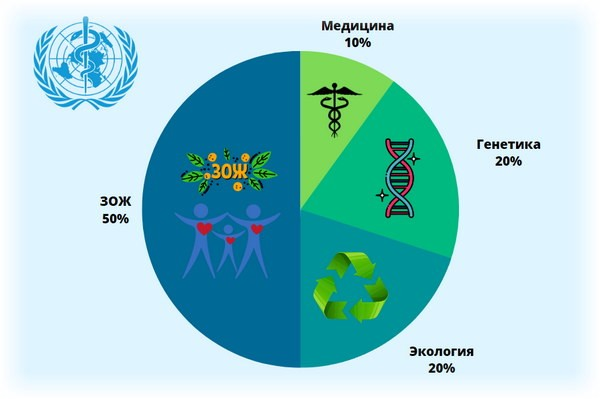 Всемирная организация здравоохранения (ВОЗ) много лет назад расписала в процентном соотношении сферы, влияющие на здоровье человека. Их нельзя недооценивать.