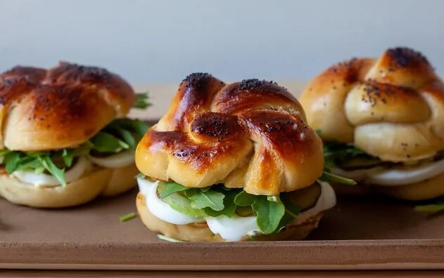 Думайте об этом как о сэндвиче с яичным салатом. Самое необходимое здесь - нарезанное вкрутую яйцо (варите примерно 9,5 минут), бриоши (лучше их, но можете использовать любой хлеб, который вам нравится), большая горсть рукколы и то, что идеально станет начинкой для бутербродов - немного майонеза, острой дижонской горчицы и хрен. Не помешает немного острого соуса - смесь должна быть острой. Между яйцом и рукколой можно положить тонкий слой чего—нибудь, обычно остатки от другого блюда — карамелизированный лук, маринованный лук-шалот, измельченный фенхель, огурец, а здесь - несколько тонко нарезанных соленых огурцов и сельдерей - и каждый из них идеален.