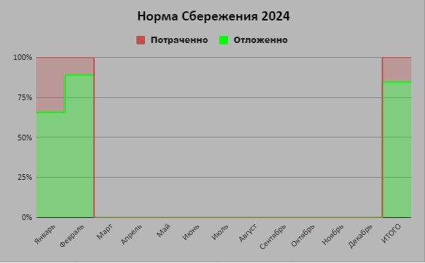 Всех приветствую, Ну что прошел февраль, а с ним и календарная зима. Хотя у нас еще реальная зима и не думает отступать. Но солнышко уже светит и день длиннее :) Норма сбережения по февралю составила - 88% Тут все просто не смотря на большие расходы в том числе и мини-отпуск в Питере такая высокая норма объясняется что годовой бонус я получил 01.02 и он упал в доходы февраля. Для сравнения Январь 2024 норма сбережения - 65% А год назад в Феврале 2023го - 80% Что интересно, что расходы очищенные от поездки выросли на 0% 40.000 я потратил в феврале 2023го и 40.000 без Питера в феврале этого года. Вот так вот получается по февралю моя личная инфляция год к году 0% :) Ну а теперь к расходам: Поездка в Питер - 61200 рублей Тут все просто основные расходы это перелет и гостиница. Покупок практически не было. Кроме еды и транспорта расходы там составили посещение стэндапа и экскурсия на трамвайчике. Еда - 22590 рублей Тут вообще все просто ни чего не обычного не было, разве что из-за праздн