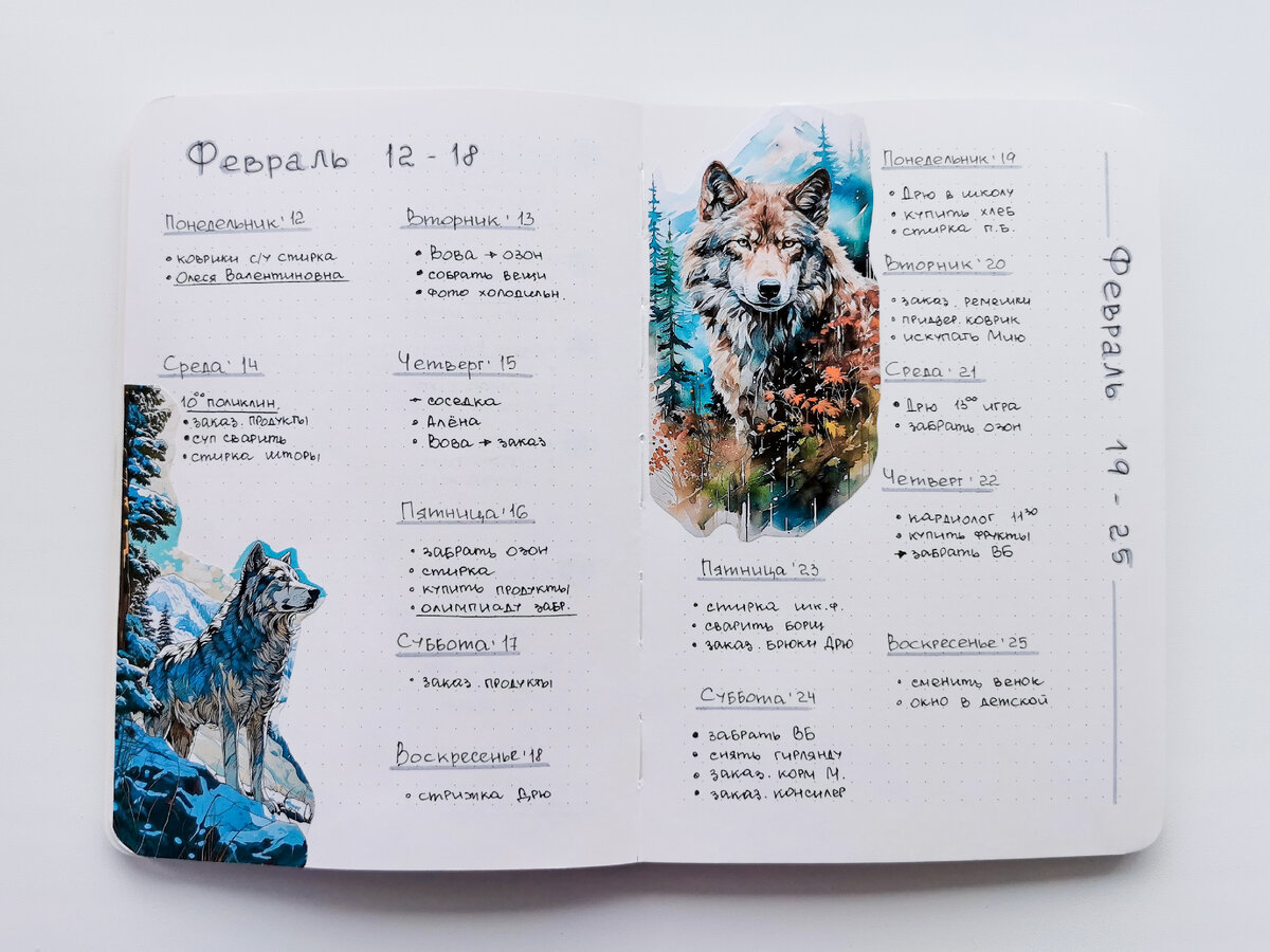 Очень понравилось мне моё оформление февраля с волками в этот раз. Здесь я показала разворот за первые февральские дни: Здесь я объяснила, почему выбрала именно волков для оформления ежедневника на февраль: А вот и сам заполненный разворот: