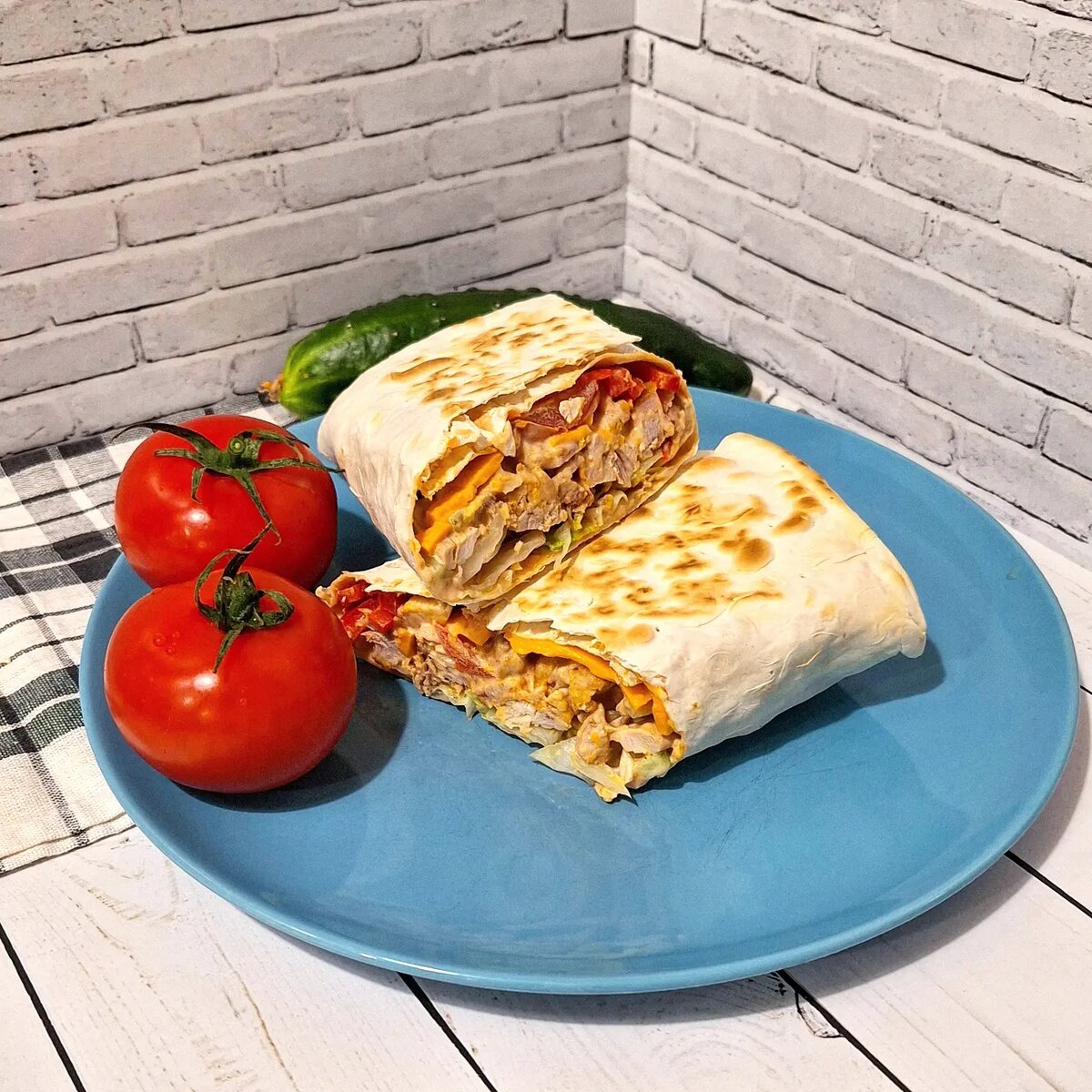 Шаурма, да еще и домашняя, - это отличное блюдо на завтрак, обед и ужин. Запеченное мясо, свежие овощи - лучше сочетания и не придумать. Ингредиенты на 1 порцию: ---------------------------------------------- ▪️Лаваш тонкий (у меня Коломенский) - 1 шт ▪️Запеченное куриное филе бедра - 150 гр, Мой рецепт запеченных бедер можно посмотреть тут #lakomo_запеченные_бедра ▪️Сыр плавленный, ломтики - 2 шт ▪️Салат айсберг - 50 гр ▪️Помидор - 30 гр ▪️Сладкий перец - 20 гр ▪️Огурец - 20 гр ▪️Майонез - 2 ст.л. ▪️Кетчуп - 2 ст.л. ▪️Чеснок - 1 зубчик Приготовление: 1. Подготовим продукты. Мясо отстрым ножом нарезать небольшими ломтиками. Овощи помыть и нарезать. Помидоры тонкими ломтиками. Перец тонкими короткими полосками. Огурец брусочками. Айсберг наркезать квадратиками 2×2 см примерно. 2. Сделать соус. Майонез смешать с кетчупом. Добавить, пропущенный через пресс, зубчик чеснока, перемешать. 3. Приступаем к сборке. На середину лаваша выложить половину соуса и размазать. На соус выкладываем с