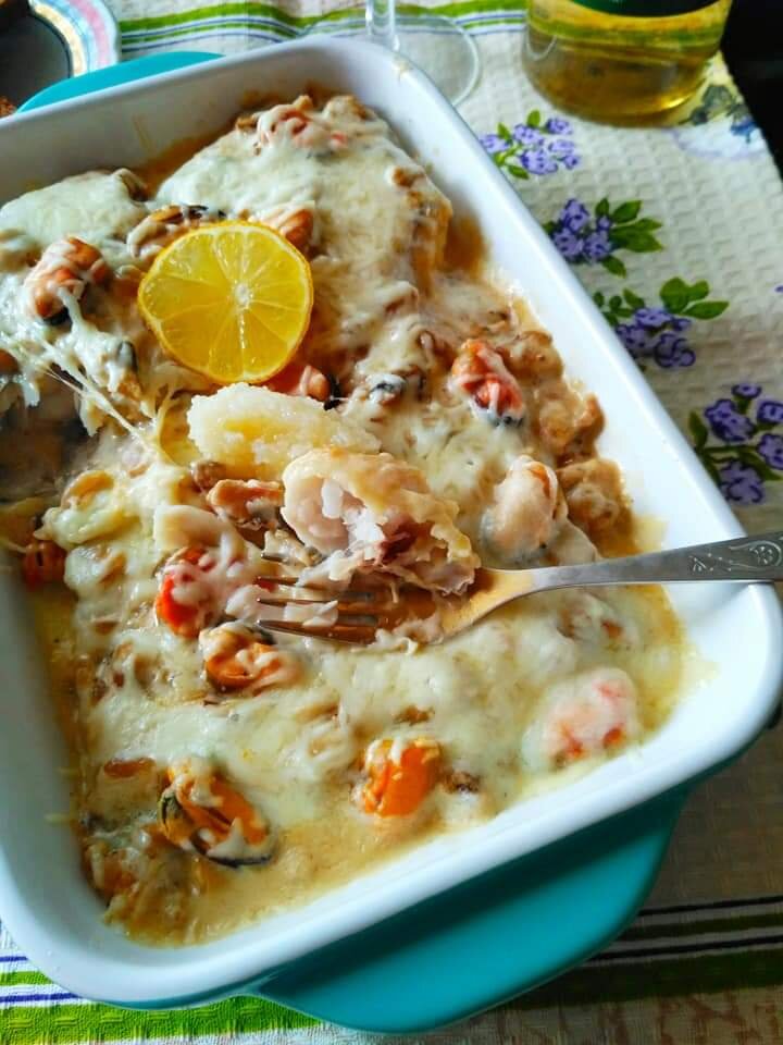 Готовим из привычных продуктов. Хек, запеченный под соусом бешамель, с грибами и мидиями. Филе хека посолить. Панировать в яйце и пшеничной муке. Обжарить на растительном масле. Выложить в форму для запекания. Бешамель с грибами - В сотейнике распустить сливочное масло. Обжарить мелко нарезанный лук и шампиньоны, до зарумянивания. Добавить белое вино и выпарить. Ввести пшеничную муку, обжарить. Постепенно, помешивая влить воду, до получения густой кремовой консистенции. Теперь влить сливки, добавить мускатный орех, соль, кориандр. Хек залить готовым соусом. Сверху выложить мидии. Посыпать моцареллой. Запечь в разогретой духовке, 10 минут. Или в микро, пять минут. Подавать с ломтиком лимона и пробойной икрой сельди.