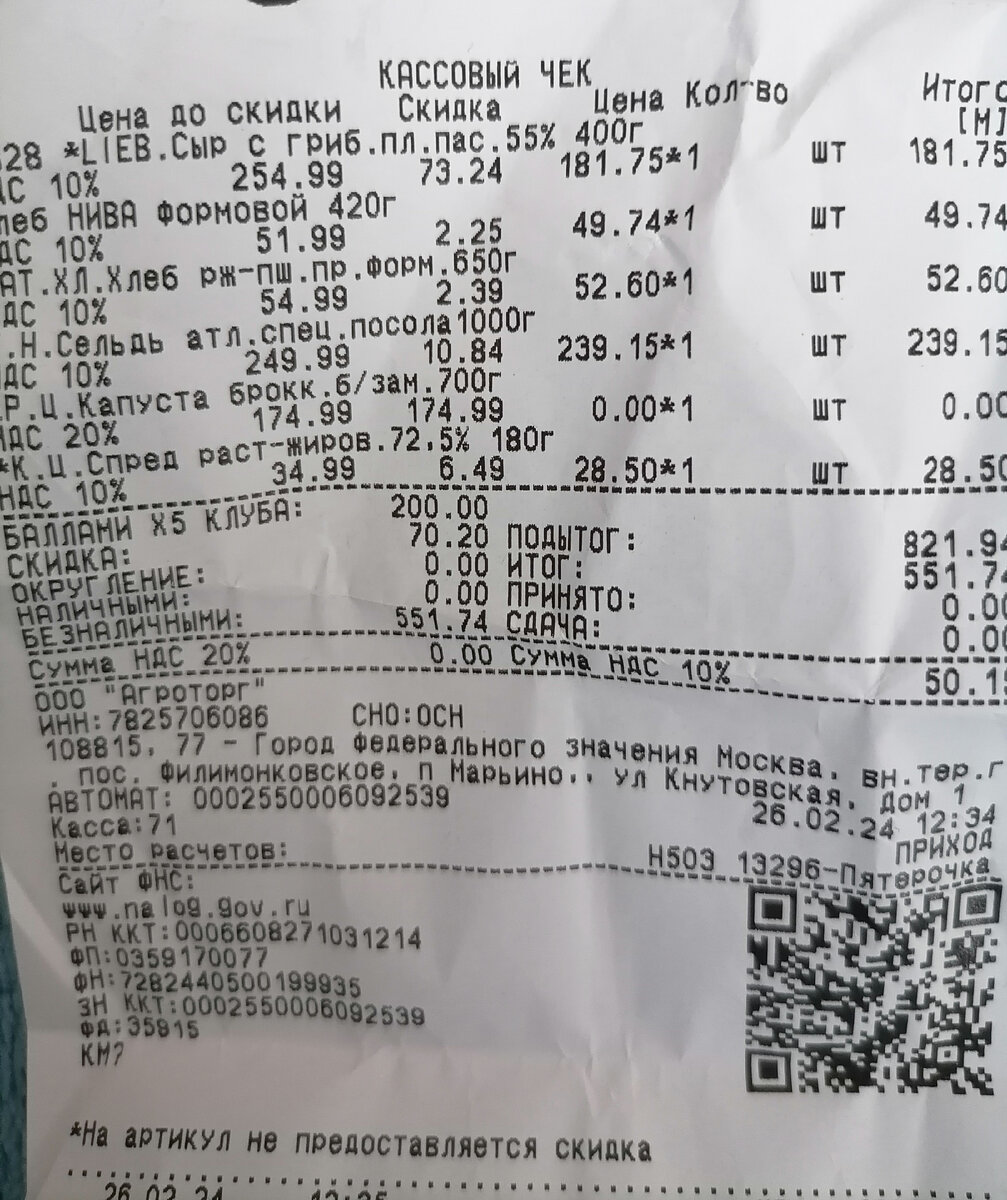 Последнюю неделю февраля начинаем с остатка 1 254 руб. 26.02.2024 г. Опять сходили за хлебом. Минус 552 руб. Капуста досталась бесплатно 🥰 Остаток 702 руб. 29.02.2024 г. Минус 630 руб Остаток 72 рубля! Решила на постоянной основе вести бюджет. Очень удобно🥰 И дело не в анализе трат, а элементарной консолидации расходов. Никогда не считала куда и сколько трачу, но вдруг стало интересно все таки куда. ГСМ считаем отдельно 4 466,50 руб. Плюс 2 299 руб. Итого за февраль: 6 766 руб. Копирую с предыдущей недели. Решила отдельным блоком учитывать расходы на связь интернет и коммуналку. На эти расходы практически невозможно влиять. Коммуналку буду учитывать в месяце, следующем за начислением , несмотря на оплату в текущем, не всегда я получаю счет в месяце потребления услуги, но должна оплатить до какого то там числа следующего месяца. Другими словами, начисления февраля буду учитывать в марте, если даже заплачу в феврале. Стало интересно сколько же мы тратим в месяц. Коммуналка: 1. Мо