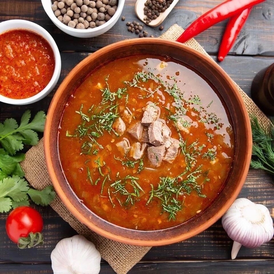ХАРЧО АРОМАТНЫЙ Ингредиенты: На 5-литровую кастрюлю: ▪️700 гр говядины на косточке. ▪️300 гр риса. ▪️4-5 средних помидоров. ▪️3 ст л соуса ткемали. ▪️2 средние луковицы. ▪️3-4 зубчика чеснока. ▪️2 ч л хмели-сунели. ▪️Перец горошком, красный перец, соль, зелень по вкусу. Приготовление: 1️⃣Мясо залить водой, варить примерно 2 часа, снимая пену. Помидоры надрезать крест-накрест, обдать кипятком, снять кожицу и протереть через сито. 2️⃣Мелко нарубленный лук обжарить с маслом на среднем огне до мягкости, всыпать острый перец, добавить помидоры, через несколько минут влить 1 половник бульона. 3️⃣Мясо снять с кости, нарез