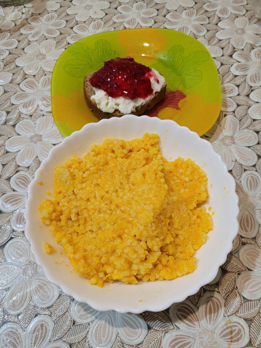 Бутерброд с сыром рикоттой и пектиновым малиновым вареньем. Кофе с молоком.