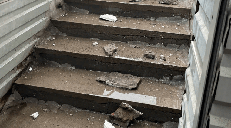 Крупные кирпичи упали на лестничный спуск.