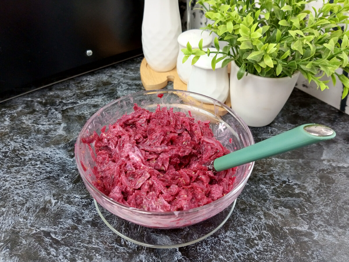 Далее готовлю салат. Свеклу заранее отварила, натерла на терке, добавила щепотку соли. Добавляю приправу "Универсальная и сбалансированная". Также столовую ложку.
