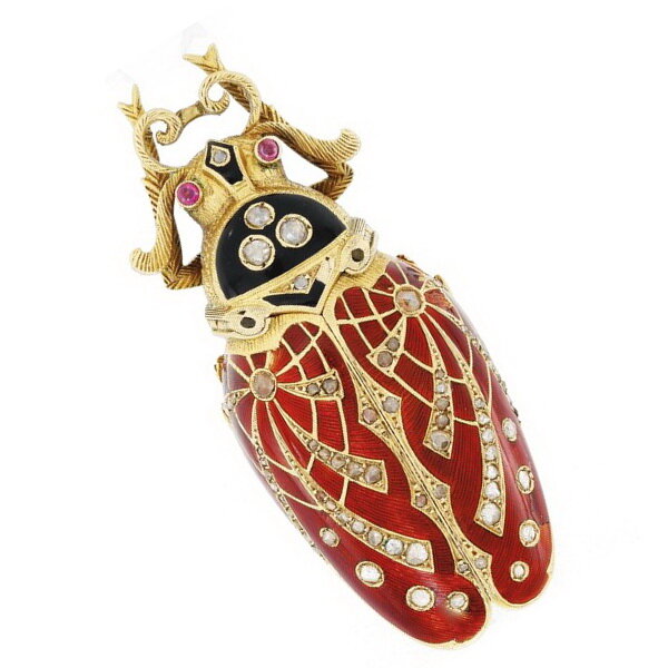 Кулон-часы в форме жука из золота с эмалью и бриллиантами, длина 5,1 см, Швейцария, около 1890 г. Кулон в форме жука – это вещь с секретом. Секрет в том, что при нажатии на кнопку, крылышки насекомого поднимаются или сдвигаются, открывая циферблат часов. Такие причудливые подвески производились швейцарскими часовщиками и ювелирами во второй половине XIXвека. Практически все подобные изделия отправлялись на экспорт, и не только в европейские страны. Большим рынком сбыта в этот период стали такие азиатские страны как Индия, Турция, Китай. Многие ювелирные изделия из этой подборки были изготовлены специально для китайского рынка.
