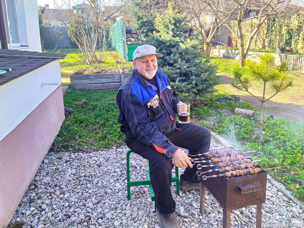 Не подумайте, судя по заголовку, что я в жизни шашлыка не ел и не готовил. Первый - это в новом 2024 году. Хотя и февраль ещё, зима как бы, но день тёплый, солнечный, вполне себе шашлычный. Мясо я замариновал ещё накануне. Взял на Старокрымском рынке кусочек свиной шейки весом чуть более килограмма. Получилось как раз на 6 шампуров. Именно столько шампуров помещается на маленький мангал. У нас есть ещё и большой мангал, там и для десяти места хватит для. Но большой я использую, когда у нас гостей много. А когда один-два человека, или мы вообще только вдвоём с Леной решаем устроить себе шашлычный день, то достаточно и малого мангала. Он у нас уже девятый год доживает. Приобрёл его по случаю у соседа-сварщика за одну тысячу рублей. Самодельный и бывший в употреблении. Но послужил нам хорошо, безотказно. Прошлым летом только дно прогорело. Но я вырезал прямоугольник из металлического листа и закрыл им место прогара. Так что этот мангал послужит нам ещё несколько лет. Маринад я делаю самы