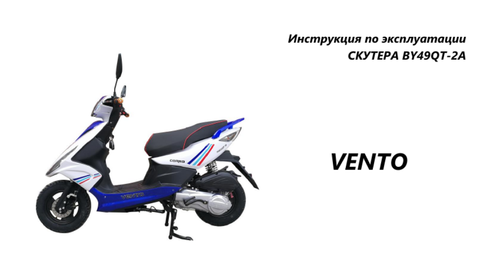 Как ни странно, но в комплекте со скутером Vento Retro идет инструкция к Vento Corsa. Судя по всему, технически это одинаковые мотороллеры, отличия сугубо в декоративных накладках, дизайне приборов, фар и т.п. Посмотреть инструкцию по эксплуатации скутера Vento Retro Может пригодиться: Не забудь подписаться! :-)