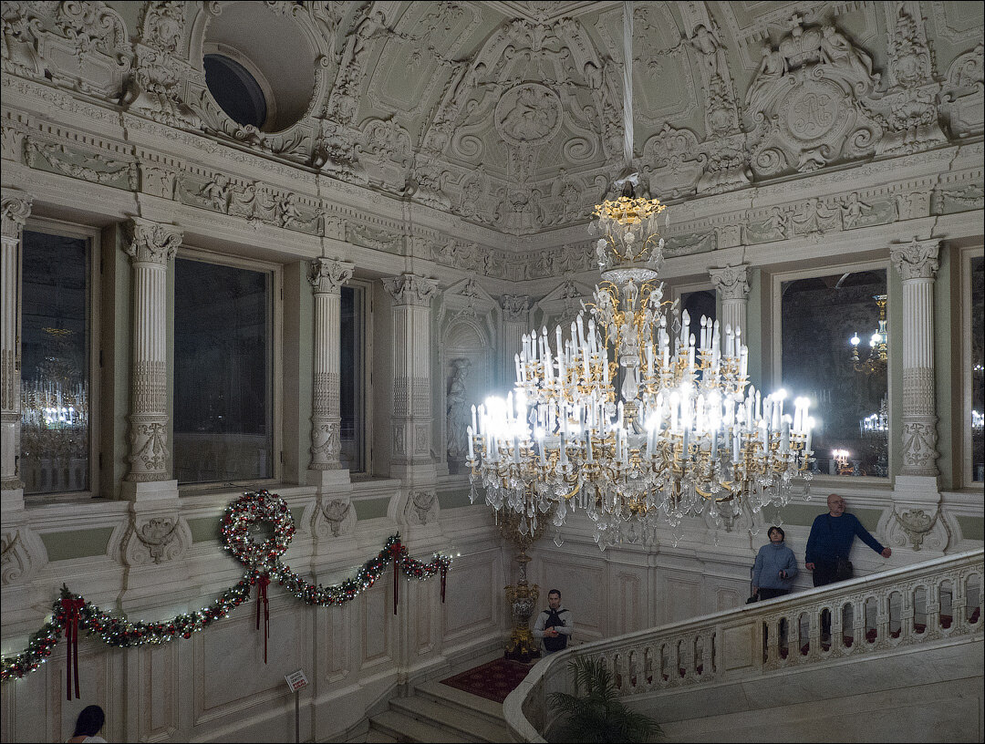 Такого впечатления от интерьеров, пожалуй, прежде нам не доводилось испытывать! Великолепие лестницы ошеломило. Вокруг всё сверкало, и оказалось вдруг проблемой выбрать, куда глядеть в первую очередь. Чем любоваться: скульптурами? огромной шикарной люстрой? самой лестницей с белоснежными перилами-балюстрадами? А за окном густым ультрамарином светились сумерки, и за стёклами справа и слева плавали загадочные очертания великолепных залов.