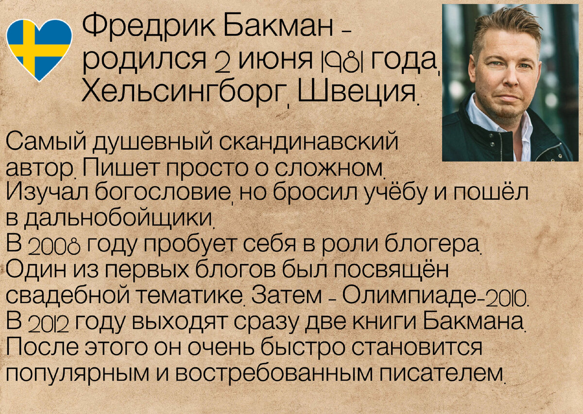 «Задолбала ты, Катя, со своими тревогами, депрессиями и выгораниями.» Если такая (схожая) мысль успела у вас проскочить после прочтения названия книги, то подождите. Секундочку. Дайте мне выступить адвокатом😅и рассказать о ней. А заодно познакомить вас с необычным скандинавским автором. Почему он не такой как все? Да потому что пишет светлые и добрые истории, а не мрачные хорроры и нуарные детективы. На фоне «идеальной» жизни в соцсетях и множества историй «успешного успеха» книги Бакмана — это что-то родное, понятное, уютное и согревающее. А ещё он наш коллега, блогер. 😃 Знакомьтесь, Фредрик Бакман Как вы уже поняли из карточки 👆🏻, путь от религиоведения до литературы пролегал через трассу 🚛 и блогерские успехи 🧑💻. А ещё Фредрик писал для газет и журналов. Фрилансил. Женился. У него двое детей: сын и дочь. Их домашние имена Лягушка и Мартышка будут и у детей «грабителя» в «Тревожных людях». Не только детские имена, но и другие события из жизни находят отражение в творчестве