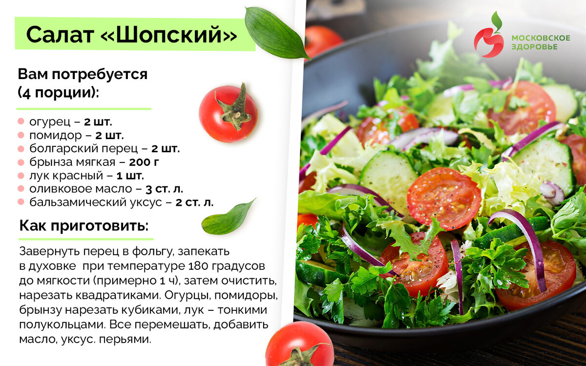 Начинаем неделю с салата! Сегодня представляем вам рецепт «Шопского» салата! Заряжаемся витаминами, но не забывайте о рекомендациях наших диетологов: Поскольку брынза относится к продуктам с довольно высоким содержанием соли, готовый салат лучше дополнительно не подсаливать Приятного аппетита!