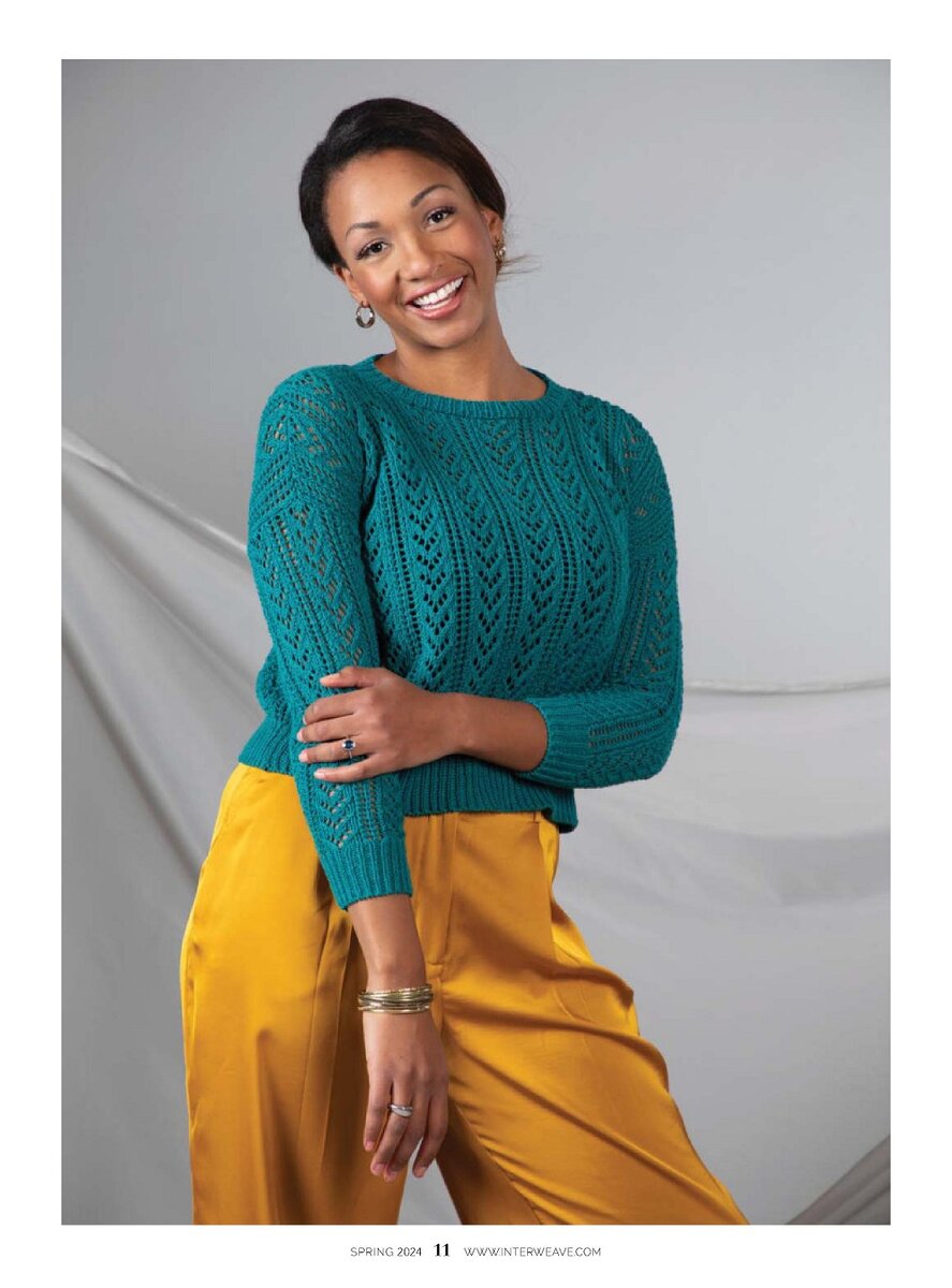 Зеленый укороченный джемпер спицами несложными ажурными дорожками, модель из журнала Interweave Knits - Spring 2024