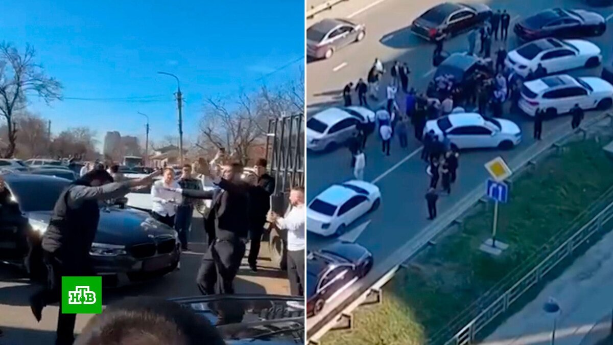 [ Смотреть видео на сайте НТВ ] Шумная краснодарская свадьба привлекла внимание полиции и СК. От былого веселья у участников торжества не осталось и следа. Они с трудом объясняют, зачем перегородили улицу своими автомобилями и стреляли в воздух. Отпираться смысла нет, гости сами выкладывали в Сеть все этапы празднования. Молва о том, как пела и плясала эта свадьба, облетела уже полстраны. Происходившее на небольшом участке трассы повергло очевидцев в шок. Удивленные жильцы местного ЖК включили камеры мобильного, пытаясь понять, почему три из четырех полос заняли какие-то шумные люди и спровоцировали пробку. Только потом выяснилось, что это были многочисленные гости церемонии бракосочетания, устроившие танцы прямо посреди дороги. Очевидцы насчитали как минимум 40 автомобилей, но это был лишь первый аккорд. Свернув во дворы, праздничная колонна напугала весь район. Видимо, решив покорить молодую и показать всю серьезность момента, появился человек с автоматом в руках. У таких невесту, мо