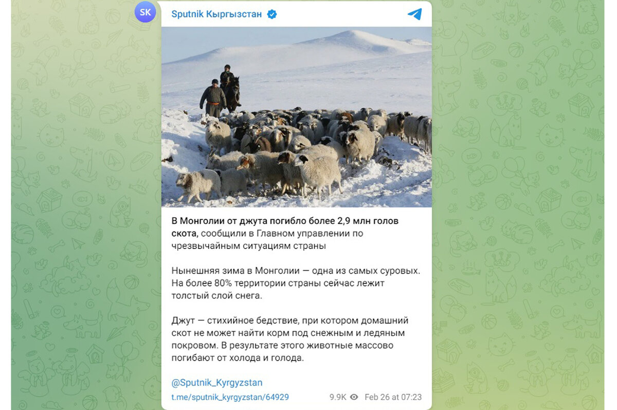 26 февраля 2024 года. Нынешняя зима в Монголии - одна из самых суровых. На более 80% территории страны сейчас лежит толстый слой снега. В Монголии от джута погибло более 2,9 млн голов скота, сообщили в Главном управлении по чрезвычайным ситуациям страны. Джут - массовый падеж скота, происходящий из-за обледенения пастбищ или обильным снегопадом, затрудняющим выпас скота (в частности, лошадей и овец), из-за чего животные погибают от голода и холода. С этим стихийным бедствием, как правило, сталкиваются в Казахстане и Киргизии. Железный джут случается после дождя, который при низких температурах замерзает и покрывает землю льдом, белый джут возникает из-за сильного снегопада. В Монголии от джута погибло более 2,9 млн голов скота, сообщил зам начальника Главного управлений по ЧС страны Ууганбаяр Батмнх. Он рассказал, что 80,6% территории Монголии поражено джутом. Из них железным джутом - 21,8%, белым - 25,9%, приводит его данные местный портал Central Asia. На конец прошлого года поголовь