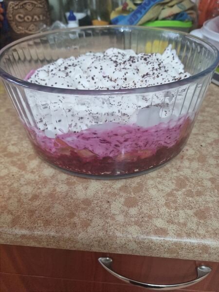 Берем пол-стакана кус-куса и развариваем. Натираем вареную свеклу и смешиваем с кус-кусом. Сюда пару зубчиков чеснока. Соль,перец и смешать с оливковым маслом. Делаем салат слоями. Выкладываем в форму. Смазываем хреном. Сюда соленую форель. Не жалейте. Я положила много,кусочками. Наверх - лук кольцами. Затем взбиваем сливки. Натираем еще вареную свеклу на мелкой терке, сюда 1-2 зубчика чеснока и аккуратно смешиваем со сливками. Выкладываем на рыбку.Взбиваем еще сливки и на верх - последним слоем.