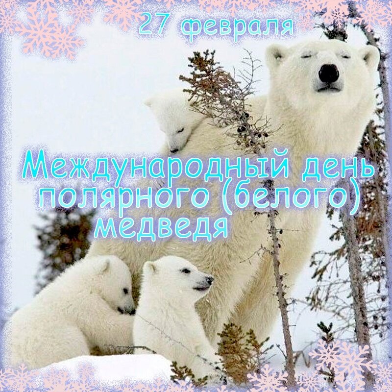 27 февраля Международный день полярного (белого) медведя.Белый медведь одно из самых красивых животных. Он отличается от других своих сородичей более удлиненным телом — неуклюжим, но довольно вытянутым; короткими, толстыми, но сильными лапами. На лапах у него широкие ступни, гораздо длиннее, чем у своих сородичей — это удобнее при ходьбе по снегу, при плаванье, а еще они помогают ему быстро бегать, нежели другим животным Севера. Длинный, густой мех состоит из короткого подшерстка и гладких глянцевитых и довольно мягких волос, которые короче на голове, шее и спине и длиннее на задней части тела, брюхе, лапах и на нижних частях ступней. Времена года не влияют на цвет шерсти: он всегда белоснежный или молочно-желтого цвета.