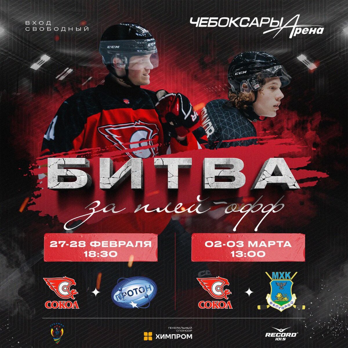 Новочебоксарский «Сокол» проведет четыре домашние игры на «Чебоксары-Арене». 27 и 28 февраля матчи первенства НМХЛ с нововоронежским «Протоном» начнутся в 18.30, 2 и 3 марта в 13.00 команда сыграет с «Белгородом». Вход свободный. Бесплатный автобус для болельщиков из Новочебоксарска отправится от остановки «Соборная площадь» со стороны ТЦ «Эссен». 27-28 февраля – в 17.30, 2-3 марта – в 12.15.
