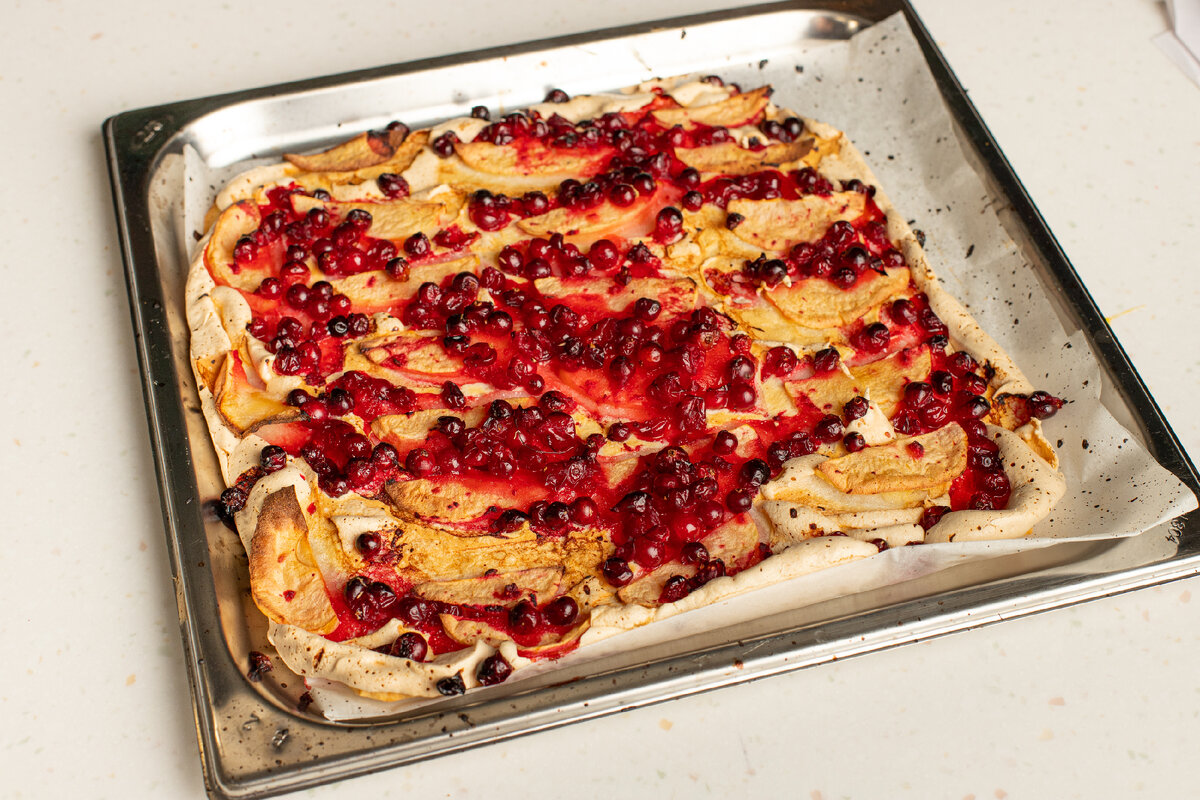 В результате получается волшебное сочетание рассыпчатого теста с кислой клюквой и нежным безе — при этом готовится такой пирог очень просто.