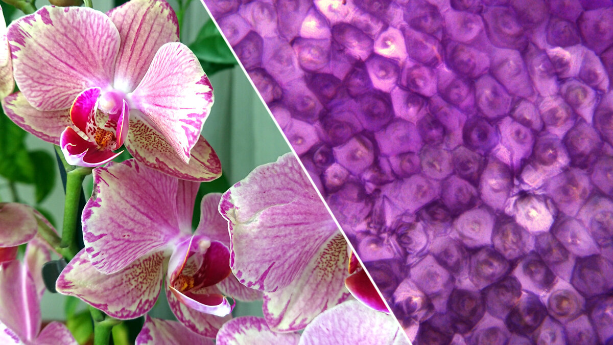 Орхомания уже захватила вас? Или на вашем подоконнике пока ещё найдётся место для «ну ещё одной» красавицы орхидеи? Уверен, что вы знаете про своё любимое растение почти всё. Осталось, наверное, только под микроскопом рассмотреть. С чем я вам с удовольствием помогу. Увеличим лепесток орхидеи в 100 раз и на первый взгляд может показаться, что он ни чем не отличается от множества других растений, но это не так. При ещё большем увеличении сразу обнаружится интересный факт, на который неподготовленный зритель, пожалуй, не обратит внимание вообще — клетки лепестка орхидеи очень хорошо отражают свет. Искривлённые белые колечки, разбросанные по всей поверхности, это яркое отражение кольцевой подсветки микроскопа. А вот, например, лепесток розы при том же увеличении: более вытянутые клетки тактильно ощущаются как бархат, но их способность отражать свет заметно ниже. Наслаждаться красотой цветка розы можно лишь в ярком свете. В то время как цветы орхидеи выглядят эффектно и при относительно сла