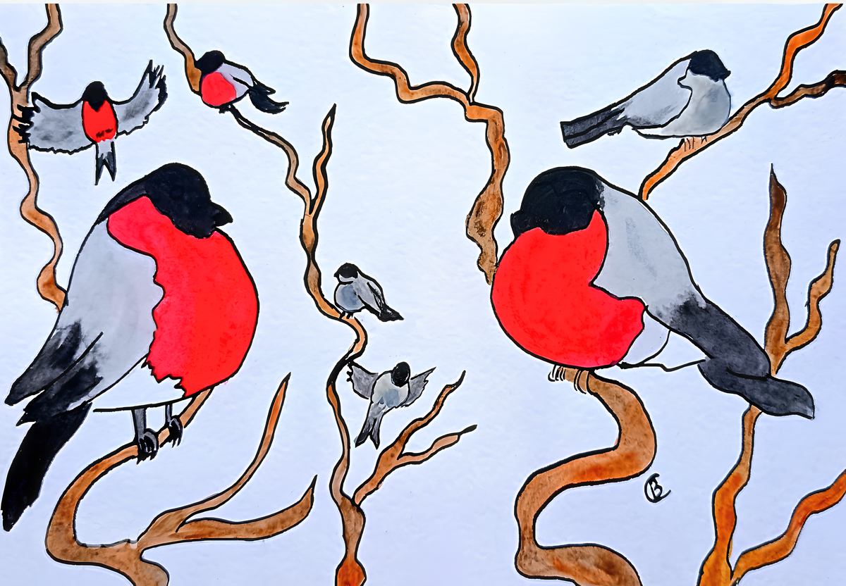 Крупные красногрудые снегири в ожидании весны коротают свое время на ветках в ожидании очередной порции семян подсолнечника, которую они делят вместе с синицами и воробьями. Как-то узнав от синиц, что есть место, где можно поживиться, они стали постоянными гостями этого сада, укутанного белоснежной шубкой. Каждое утро они гурьбой прилетают и терпеливо ожидают часа насыпания семечек в кормушку. Их скрип, так непохожий на щебет синиц или чириканье воробьев, сразу выделяется в певческом хоре. Такие большие и яркие, они приковывают к себе восторженные взоры. В отличие от своих соседей по кормушке, они более осторожны и ни разу не попадались в лапы кошкам. Скоро придет весна. Снегири улетят в свой родной лес, в котором они насладятся спокойствием и обилием разнообразной пищи. Автор и художник Вилена Салтыкова