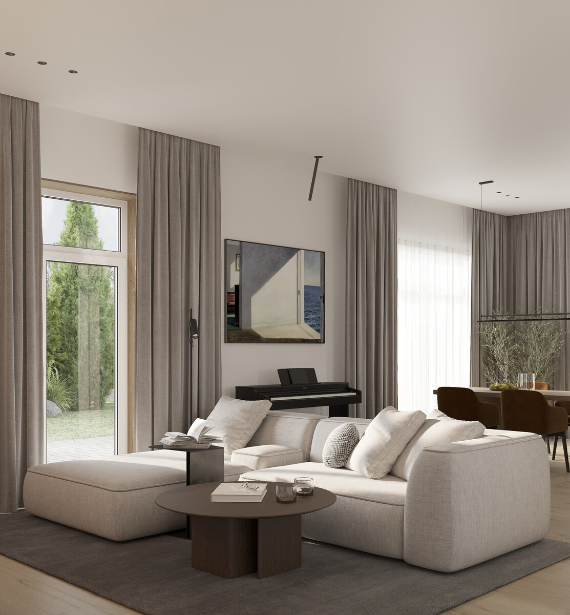 По задумке интерьер должен получиться в современном минималистичном стиле, максимально открытым и наполненный воздухом. Для этого мы объединили гостиную, кухню и столовую. Так в доме появилось большое открытое центральное пространство.