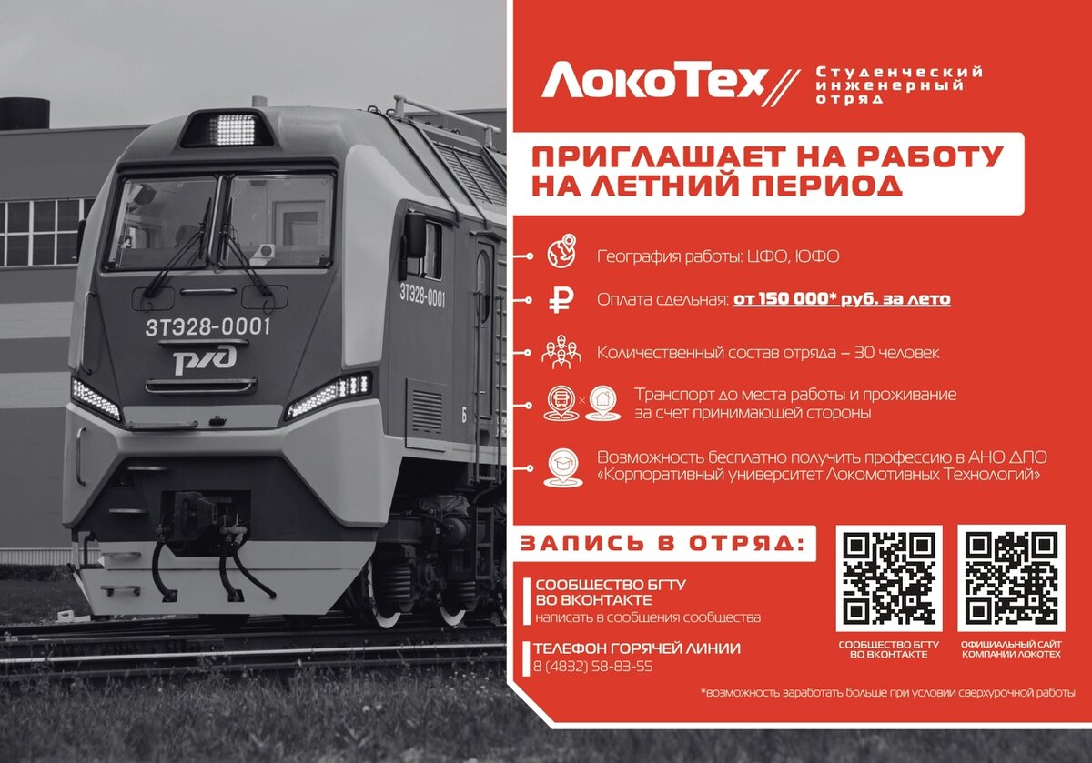 БГТУ совместно с ГК «ЛокоТех» объявляет набор в студенческий инженерный отряд! Условия: