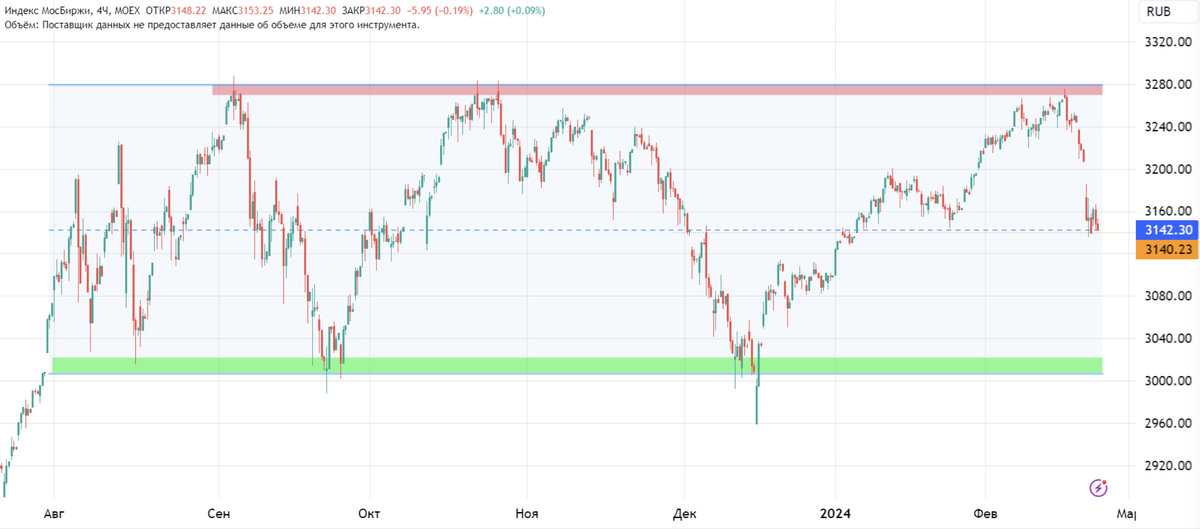 Дальше нужно смотреть по ситуации: пробой уровня открывает путь для дальнейшего роста, в то время как отбой или ложный пробой — для снижения к нижней границе боковика. Я думаю, что если рубль все же перейдет к укреплению, индексу будет сложновато выйти вверх из этого боковика до выборов.