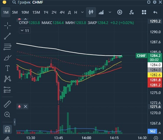$CHMF Вот так выглядит минутный график, где робот гонит цены вверх. Может непреднамеренно... но это так очевидно, если заглянуть в стакан. Там появлялась заявка, которая приростала по 3-5 лотов с большой скоростью пока не доходила до 5000-7000 лотов, потом когда цена продвигалась вверх на пару пунктов эта заявка так же быстро по 3-5 лотов убиралсь и переставлялась на последнюю цену покупки. Возможно перед крупной заявкой выставляются заявки поменьше где-нибудь по 100 лотов, которые раскупаются теми, кто видит движение цены вверх, но это только догадка. Факт в том, что своими действиями робот поднял цену ровно на 1%