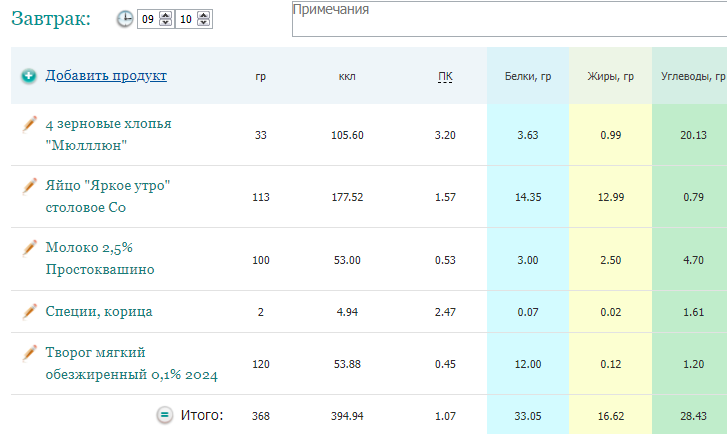 Дневник питания 26.02.24 (+отчет по тренировке)