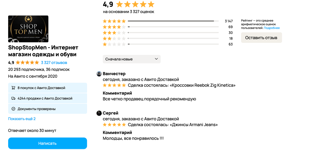 Сразу скажу, магазинов отзывов - десятки. Почти все они накручивают ботов. Такие отзывы авито удаляет через несколько дней в лучшем случае. В худшем просто блокирует аккаунт. Я протестировал несколько магазинов, разочаровался. В данном конкретном магазине отзывы публикуют хотя бы люди, а не боты. На этом плюсы заканчиваются.