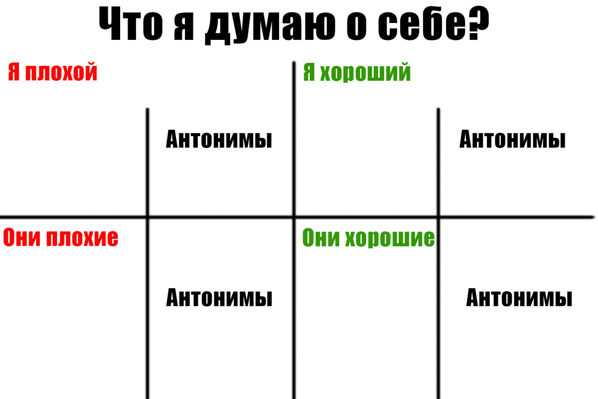 Предлагаю вам заполнить такую табличку. Когда я хороший, то какой я? Ну и когда, соответственно - плохой. Попробуйте в виде прилагательных. Сначала заполните пустые клеточки, потом подберите к каждому слову – антоним.