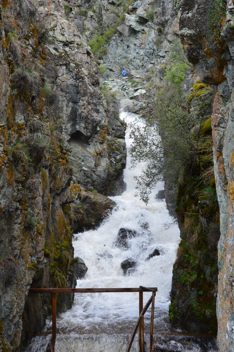 Над водопадом установлен знак с его названием. В каскаде в ущелье установлена лестница-настил, по которой можно подняться вверх и побывать в самом сердце второго порога. Стоя на мостике, Вы видите нижний каскад, до верхнего надо подняться вверх по течению Бельтертуюк. Вы сможете подойти и умыться холодной водой, выйти на обзорную площадку с видом на Катунь, сделать хорошие фотографии. Верхний каскад 29 метров «зажат» между двумя массивными скалами. Реку Бельтертуюк при впадении в Катунь пересекает небольшой деревянный мостик, под которым проходит нижний каскад водопада 11 метров. С этого моста, проложенного над водопадом, можно спуститься вниз к Катуни по каменистой тропинке и посмотреть на нижний каскад. Далее дорога уходит к скалам «Великаны».