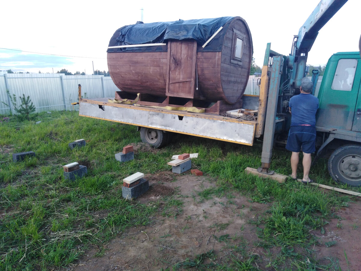 наконец то привезли мне баню бочку ждал два месяца! хотя обещали один месяц и она у меня. Как всегда блин. Размеры небольшие да и куда мне огромную Парная 2 метра и предбанничек 1.5 метра, диаметр бочки 2 метра. Снаружи вроде не большая, а внутри вообще не чувствуешь, что мало или давит клаустрофобии нет) Это парная корпус сосна, а полки липа. Прокалить печь и можно закладывать камни и сразу пользоваться. это вид бани снимаю в окно предбанника. А это сам предбанник. Ну по бане могу сказать что летом чтоб ее натопить хватает 4 поленьев и 40 минут всеее можно упариться. зимой значительно больше дров и пару часов времени но и в минус 27 в ней можно без чувств выйти))) Но есть и косяки это двери баня постоянно то расширяется то сужается и иногда двери клинит. На готове держу рубанок)) В общем баней пользуюсь третий сезон ничего не сгнило, надо ее хорошо просушивать и обработать спец средствами. Сделал крылечко))) По той самой технологии. Подписывайся всяк и следующий пост будет про то как