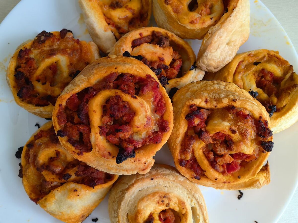 Свернуть в рулет. Нарезать на кусочки толщиной 2 см. Выложить на противень, застеленный бумагой. Выпекать 10 минут при 220 градусах.